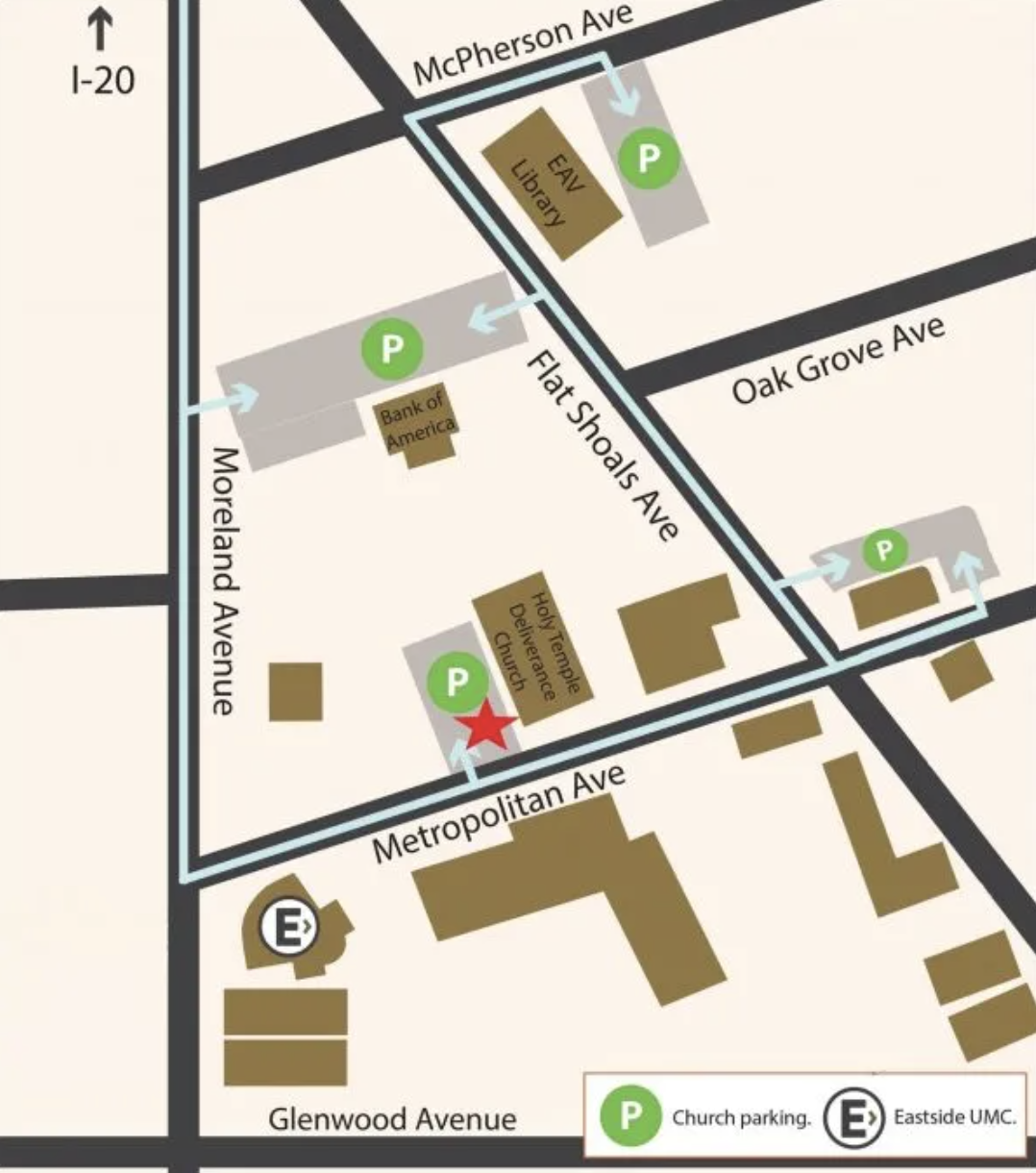 We're located at 468 Moreland Ave SE, Atlanta, GA 30316 at the corner of Moreland and Metropolitan Ave.  We have parking across the street off Metropolitan Ave. You can enter the building through the front doors off Moreland. The doors at the rear of the building through the garden will take you to our coffee bar and Eastside Kid's Collective wing. The following map will show you where our parking is located (red star).  The green lots are open for Eastside attenders. Accessible entrances to the building are available through the garden.